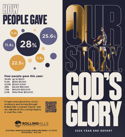 This has been an incredible year for us at Rolling Hills Covenant Church. We have come together throughout the year as a church family to grow closer together and develop deeper connections through various events and ministries. We have celebrated testimonies and baptisms of what God has done in the lives of many who have been saved through the power of God’s Spirit. We have also been blessed over the last 12 months through the Lord bringing us three amazing new pastors: Alex Enfiedjian, Bob Cubillos, and George Beardsley. We have also been blessed to hear reports of what God is doing around the world through the nearly 60 missionaries that we support as a church. There is much to celebrate and praise our heavenly Father for!