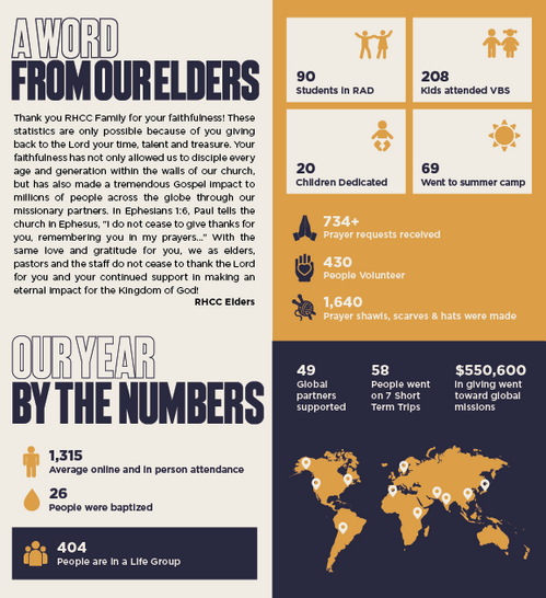 As we approach 2025, we want to take a moment to invite you to continue to participate in a special way in the work that God is doing here at RHCC and around the world. Your financial gifts are crucial in enabling us to continue our ministry and extend the message of the Gospel to those who need to hear it most. If you have not yet participated, we invite you to prayerfully consider making a year-end gift to RHCC. The gifts we receive during December represent about 20% of our annual budget and helps us set the pace for our next year of ministry.